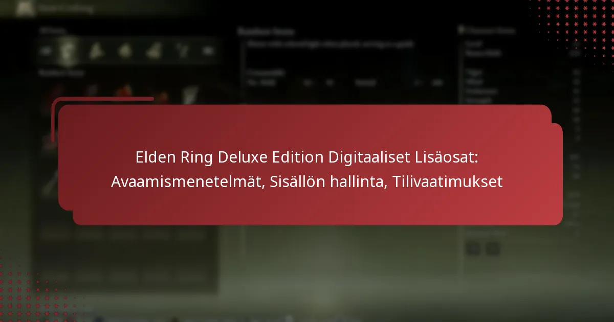 Elden Ring Deluxe Edition tarjoaa joukon digitaalisia lisäosia, jotka voidaan avata eri menetelmillä, mukaan lukien lunastuskoodit ja alustakohtaiset prosessit. Oikea sisällönhallinta on olennaista näiden lisäosien lataamisessa ja järjestämisessä, mikä parantaa kokonaisvaltaista pelielämystäsi. Lisäksi pelaajien on täytettävä tietyt tilivaatimukset pelialustastaan riippuen, jotta he voivat käyttää näitä digitaalisia bonuksia tehokkaasti.